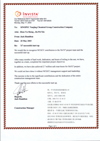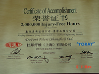 During 2002 to 2003, undertaking the mechanical installation work of CH1-X6/CH2-X7 projects of American DuPont Fibers (Shanghai) Co., Ltd. and getting a higher evaluation from DuPont and new owner—INVISTA because of no safety accidents for 2,700,000 safety hours, excellent quality and successfully start-up only one time as the scheduled. Therefore, the owner’s site construction manager said in the letter of “Successful Start up” that “We could not have done it without Nanjing Suhua Company’s support and leadership.”
