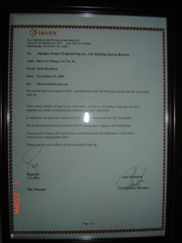 During 2005 to 2006, undertaking the mechanical installation work of H3-X8/CH4-X9 project of American INVISTA Fibers (Foshan) Co., Ltd. and awarded a higher praise by INVISTA because of 3,000,000 safety injury-free hours, good in quality and successfully startup of the plant only one time and 22 days in advance comparing to the scheduled period. Therefore, INVISTA had a royal startup celebration of the plant on November 1st , 2006 and issued the news in the globe.